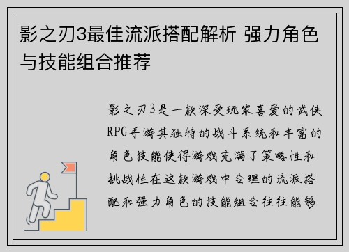 影之刃3最佳流派搭配解析 强力角色与技能组合推荐