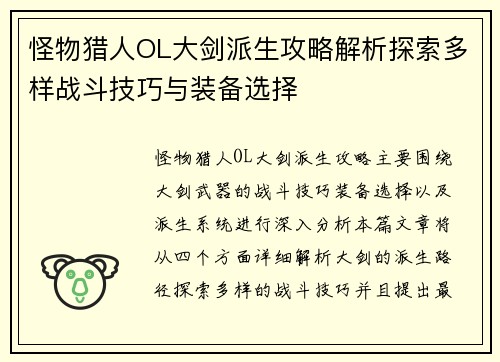 怪物猎人OL大剑派生攻略解析探索多样战斗技巧与装备选择